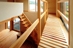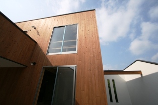 白い大きな壁が木の家を「抱きしめている」様な感じにデザイン。包み込む壁と建物の間をデッキとし半屋内的な感覚で人目を気にせず楽しめる空間とした。外部との繋がりを考えつつプライバシーを確保。