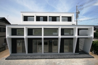 白と黒の外観は建物に奥行きと広がりを与え、特徴的な庇(ヒサシ)により、心地良く変化した太陽光は全室に注ぎ室内は大きな窓から庭、空へとつながり、無限の空間を創り出します。伸び伸びと、明るく、心を大きく広げる住まいです。